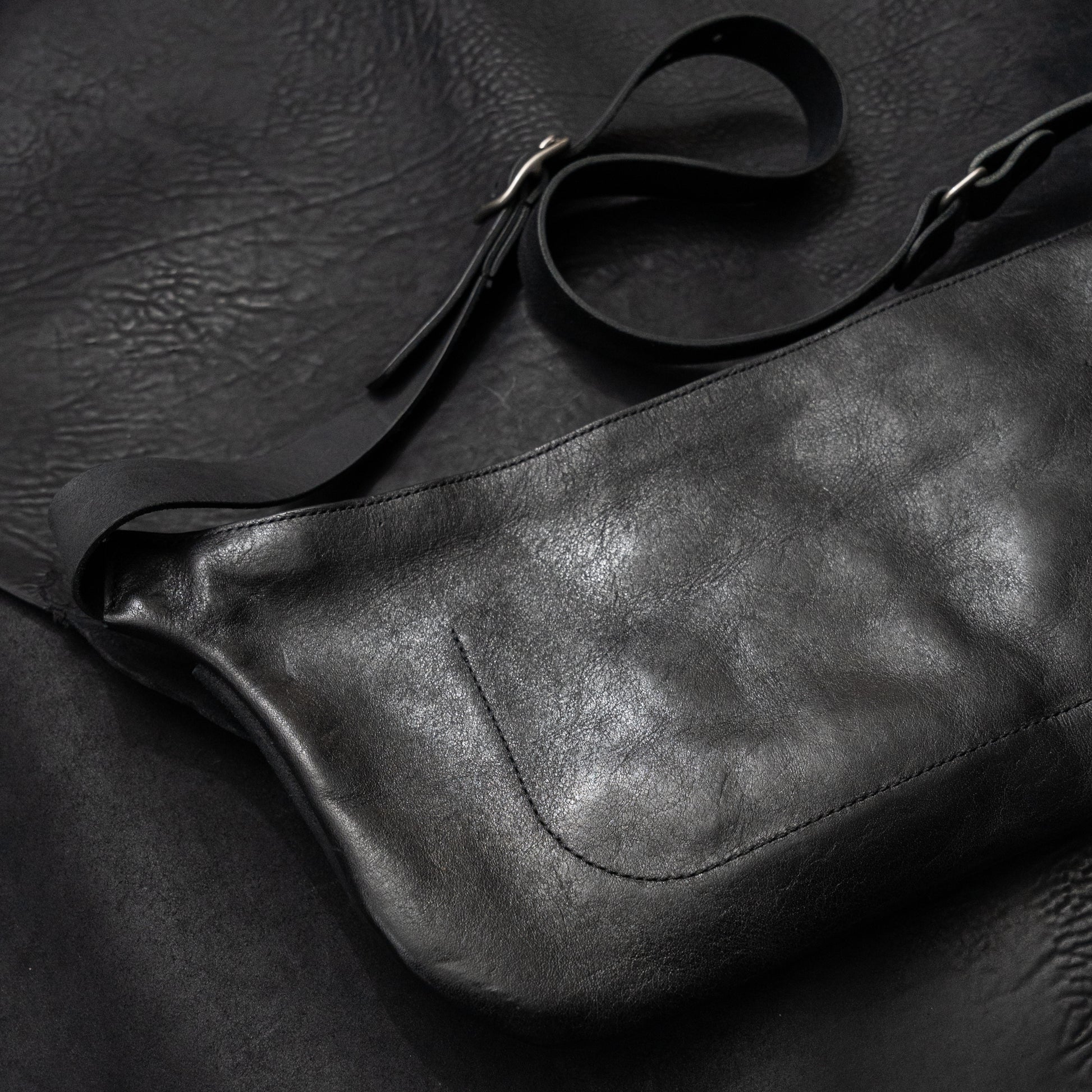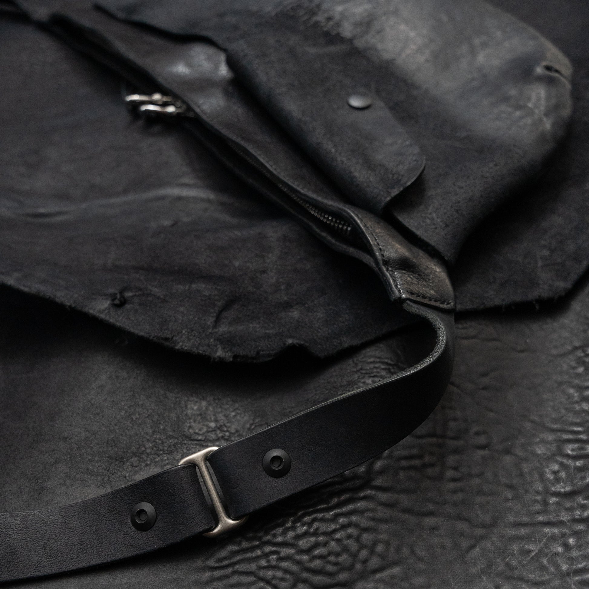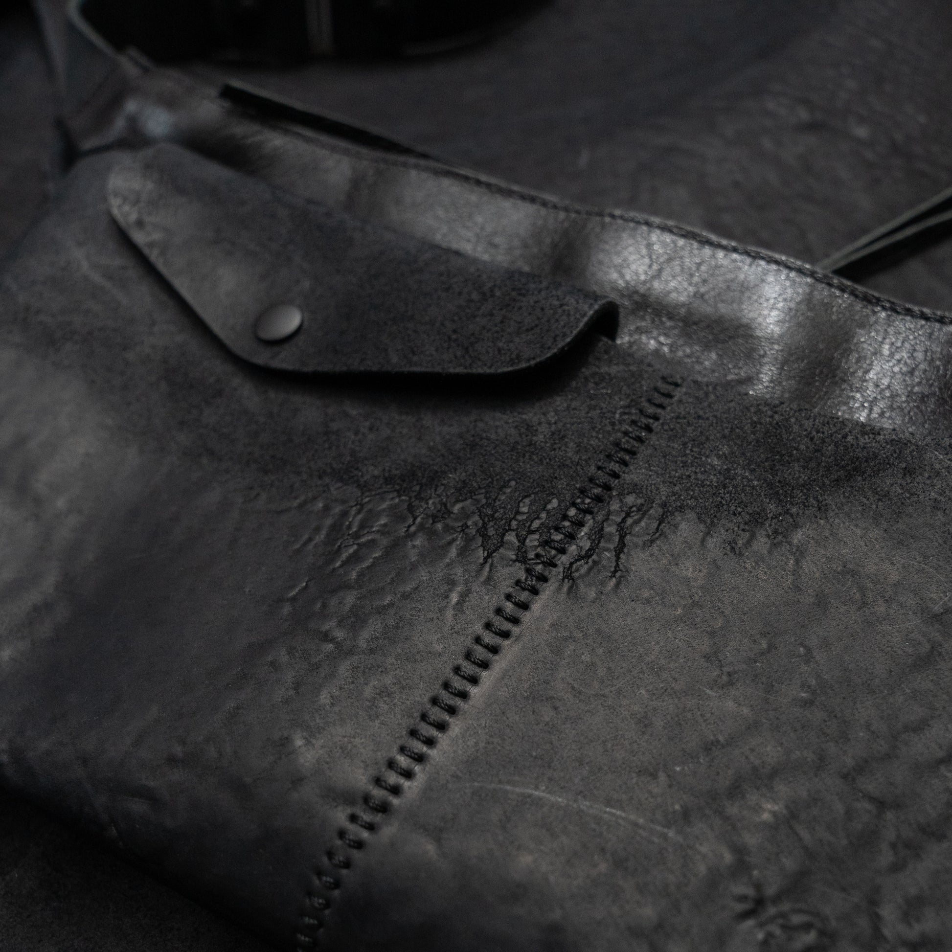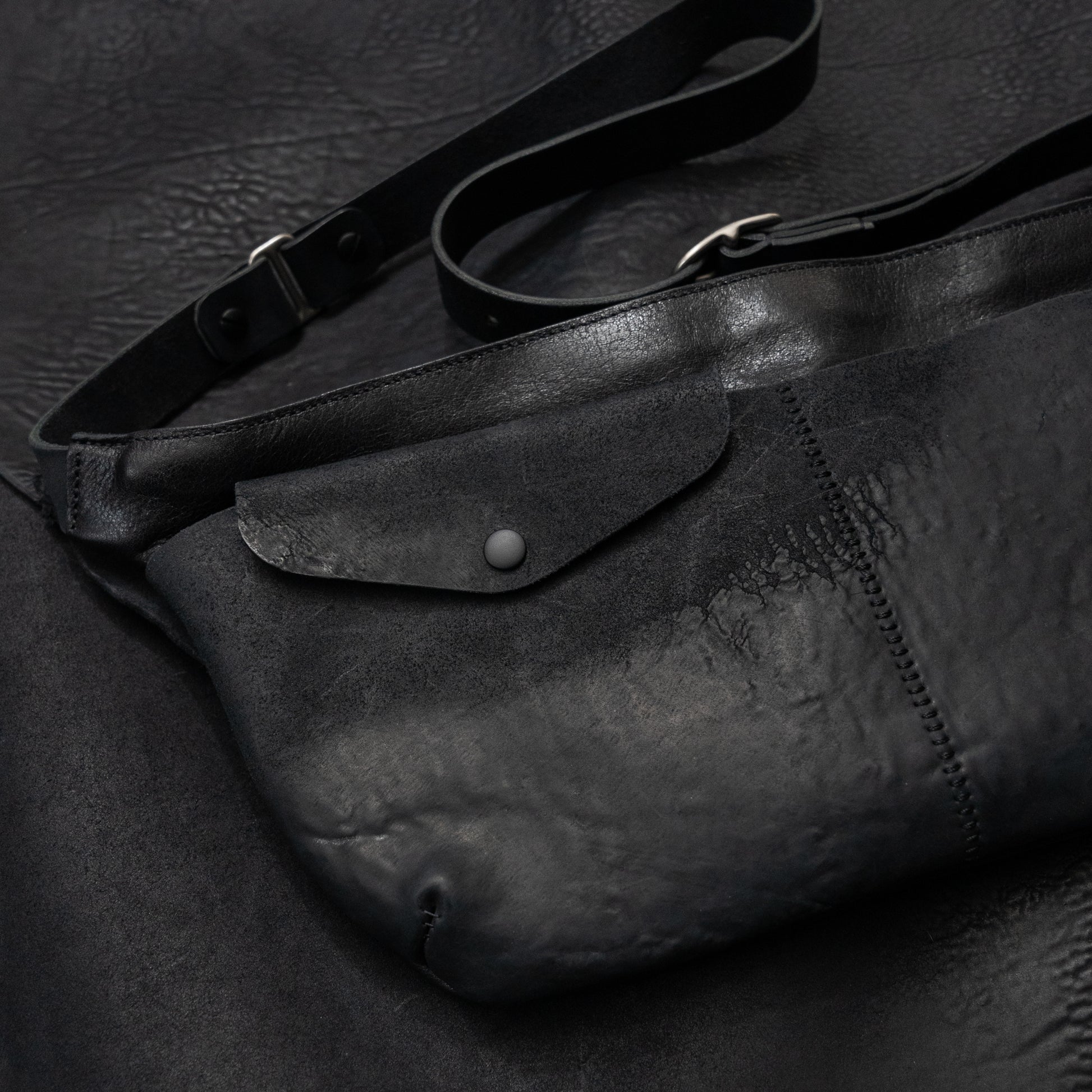 The main body is constructed from black Horween horsehide, selected for its dense grain, durability, and ability to develop a rich patina over time. The front section is made from Italian reverse culatta and divided into two exterior pockets, one finished with a snap flap for secure, quick-access storage.